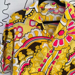70S YELLOW/PINK GEOMETRIC DAISY PSYCHEDELIC PRINT COLLARED BUTTON UP BLOUSE
