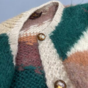AMAZING! 1980S MUTLI-COLORED GEOMETRIC DESIGN FULL LENGTH MOHAIR SWEATER GLAZED CERAMIC BUTTONS