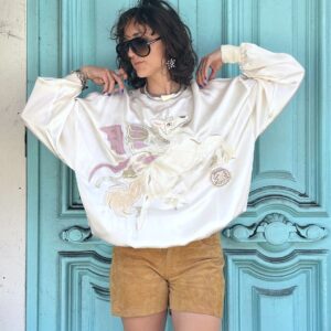 AS-IS WOW! 1980S 100% SILK UNICORN EMBROIDERED SWEATSHIRT, RIBBED COLLAR & CUFFS