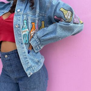 ADORABLE CROPPED DENIM JACKET WITH ALLOVER EMBROIDERED SODA BOTTLE PATCHES