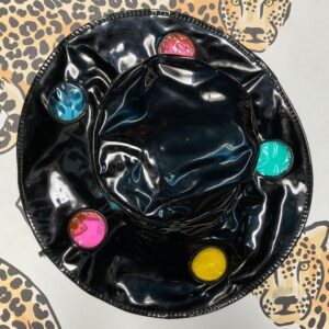 UNIQUE 1960S RAIN WEATHER VINYL BRIMMED BUCKET HAT W/ MULTICOLORED POLKADOT WINDOWS