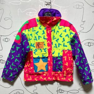 RAD 1980S YOUTH ABSTRACT PRINT NEON DAY-GLOW SKI JACKET LIGHTNING BOLT DESIGN SMALL FIT