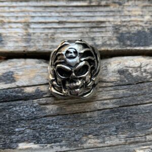 DEATH SKULL WITH SKELETON HANDS OVER HEAD CHUNKY STAINLESS STEEL BIKER RING