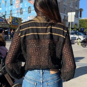 AMAZING 1980S-90S CONTEMPO GOLD STRIPED AND NET CROPPED ZIP-UP JACKET WITH CINCHED WAIST