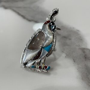 BEAUTIFUL 925 STERLING SILVER QUAIL RING CARVED MOTHER OF PEARL, TURQUOISE, CORAL, ONYX