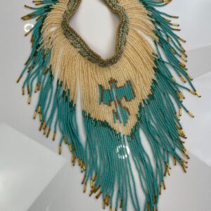 BEAUTIFUL! THUNDERBIRD DESIGN FULLY TURQUOISE BEADED FRINGE COLLAR NECKLACE, LEATHER BACKED