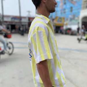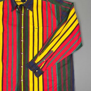 3 PIECE SET – 1990S VERTICAL STRIPED COLOR BLOCK SHORT SLEEVE BUTTON DOWN SHIRT & SHORTS + BELT