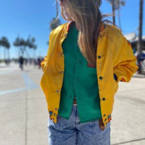 1970S-80S SUPER RARE FUNKY CRAYOLA COLORED SATIN JACKET RAINBOW TRIM – AS IS