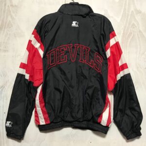 NEW JERSEY DEVILS FRONT LOGO BACK LETTERING NHL HOCKEY WINDBREAKER JACKET WITH ZIP FRONT DUAL ZIPPER POCKETS NYLON LINING HIDDEN VELCRO HOODIE AS-IS