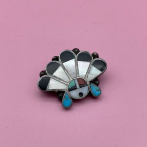 925 ZUNI SUNFACE TURQUOISE, MOTHER OF PEARL, ONYX INLAY STERLING SILVER BROOCH PIN