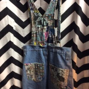 DENIM SHORTS – OVERALLS – LEATHER TRIM – DECORATIVE PATCHWORK POCKETS/TOP/STRAPS