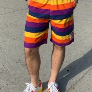 1990S VIBRANT HORIZONTAL STRIPE DESIGN BATHING SUIT SHORTS W/ DRAWSTRING WAIST