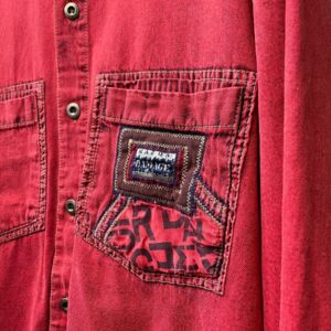 1990S | EARLY Y2K IRIDESCENT OVERDYED RED DENIM JACKET FUNKY ANGLED POCKETS