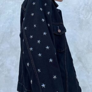 AMAZING 1990S (OR 70S) BLACK OVERDYED LEVIS DENIM TRUCKER JACKET W/ STAR STUDDED SLEEVES & CONTRAST STITCHING