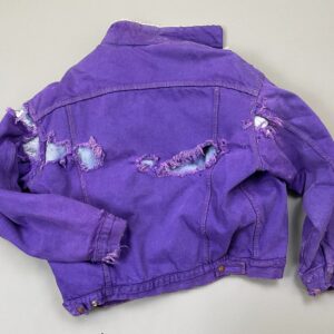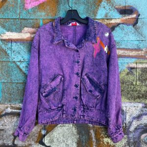 RAD! 1980S-90S PURPLE OVERDYED ACID WASH DENIM JACKET W/ LEATHER APPLIQUE DESERT SCENE