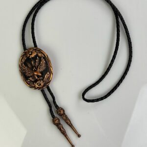 ORNATE EAGLE COPPER BOLO TIE, BLACK BRAIDED LEATHER CORD, DECORATIVE END TIPS