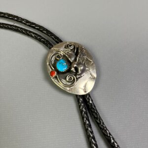 STERLING SILVER EAGLE DESIGN BOLO TIE TURQUOISE & CORAL STONES