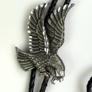 ETCHED PEWTER FLYING EAGLE DESIGN BOLO TIE, BRAIDED LEATHER CORD, SIGNED 89