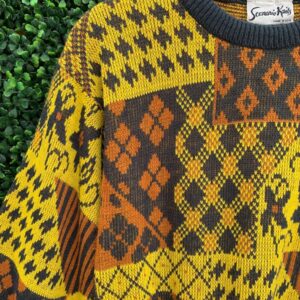 VINTAGE KNIT MIXED HOUNDSTOOTH, DIAMOND, FLORAL, SMILEY FACE PATTERN SWEATER