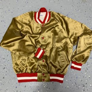 SAN FRANCISCO 49ER’S NFL SATIN FOOTBALL JACKET W/ STRIPED CUFFS/COLLAR/HEM