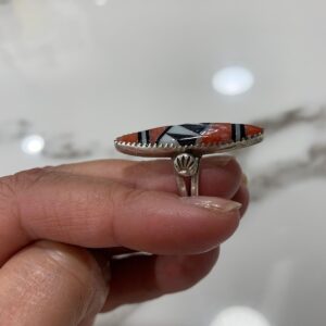 AWESOME CORAL, ONYX & MOTHER OF PEARL INLAY RING W/ TRIBAL DESIGN