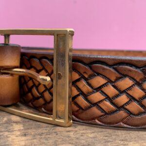 TOOLED & EMBOSSED CROSSHATCH BROWN SHADED EDGES LEATHER BELT