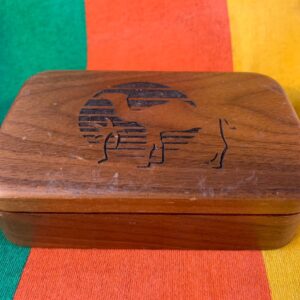 WOODEN KEEPSAKE BOX W/ BURNT ENGRAVED CAMEL & SETTING SUN VELOUR INTERIOR