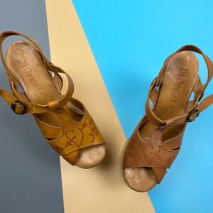 *AS-IS* RARE! AMAZING STACKED WOOD FLORAL & HEART ENGRAVED LEATHER PLATFORM SANDALS