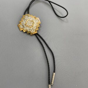 AMAZING OVERSIZED SILVER & BRASS ENGRAVED GEOMETRIC SHAPE PENDANT BOLO TIE & BLACK LEATHER WOVEN CORD