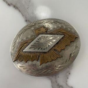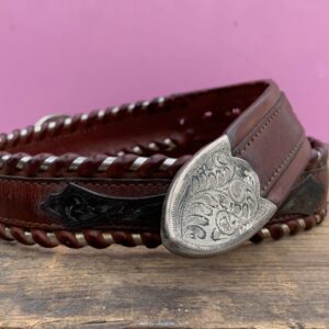 HEAVY BROWN LEATHER BELT METALLIC SILVER WHIP STITCHING, ENGRAVED 925 STERLING SILVER PLAQUE & END TIP (AFTER-MARKET BUCKLE)
