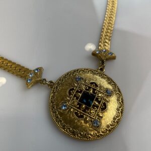 COOL! ORNATE MEDALLION PENDANT NECKLACE BLUE RHINESTONES, FLAT CHAIN LINK