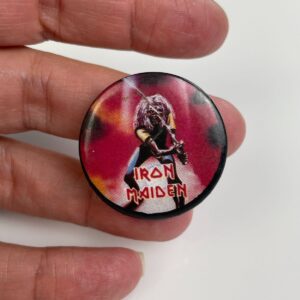ORIGINAL 1980S IRON MAIDEN EDDIE PLAYING GUITAR GRAPHIC BUTTON PIN