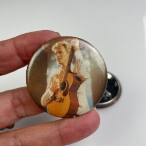 ORIGINAL 1980S DAVID BOWIE PLAYING ACOUSTIC GUITAR BUTTON PIN