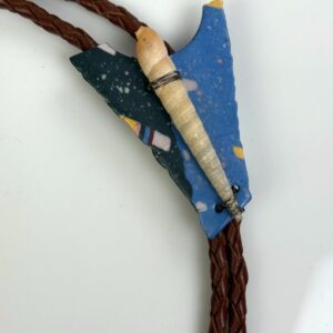 FUNKY! 1980S ARTSY SHELL & INLAY TERRAZZO BOLO TIE, BROWN LEATHER BRAIDED CORD, 925 STERLING TIPS