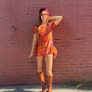 SO FREAKIN CUTE! SLINKY 1960S AZTEC PRINT SHORT SLEEVE MINI DRESS