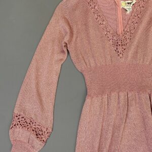 UNREAL!!! 1960S-70S CREAMY PINK KNIT LUREX MAXI DRESS CROCHET TRIM