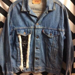 1980’S-1990’S HOT TRACKS DENIM JACKET – TWO-TONED – FULLY LINED – SCREEN PRINTED DESIGN INSIDE
