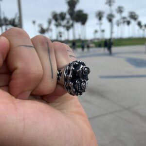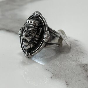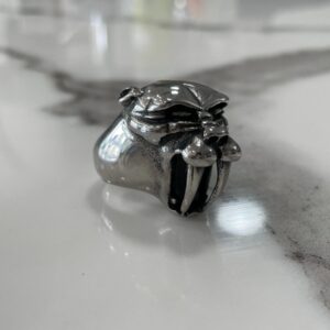 ORNATE CARVED SKULL WITH WRAPPED DRAGON\’S PAW STAINLESS STEEL SILVER RING