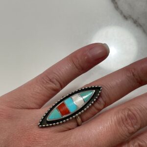 ELONGATED INLAY TURQUOISE, CORAL & MOP STERLING SILVER RING *SIGNED
