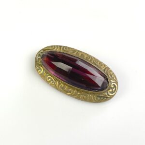 ORNATELY STAMPED ANTIQUE BRASS BROOCH, FACETED AMETHYST STONE