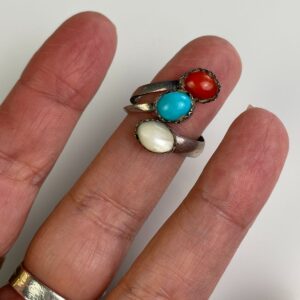 CUTE 925 TRIPLE POLISHED STONE ADJUSTABLE STERLING SILVER RING (CORAL, TURQUOISE, MOP)