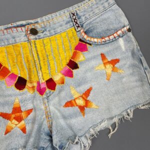 *AS-IS* AMAZING FULLY EMBROIDERED SUN & STAR DESIGN LIGHT WASH FRAYED HEM DENIM SHORTS