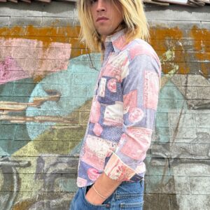FUN! 1990S PATCHWORK RAYON LONG SLEEVE BUTTON DOWN BLOUSE