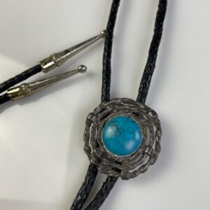 FAUX TURQUOISE ENCASED BOLO TIE, BRAIDED LEATHER CORD