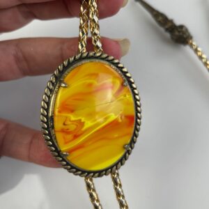 OVAL POLISHED MARBLED GLASS STONE BOLO TIE, TWISTED ROPE SETTING