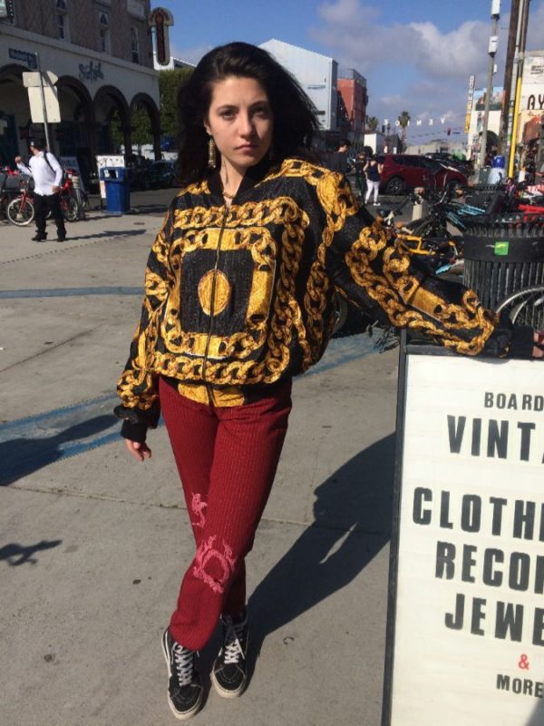 100% POLYESTER CHANEL-STYLE CHAIN PATTERNED ZIP-UP BOMBER JACKET