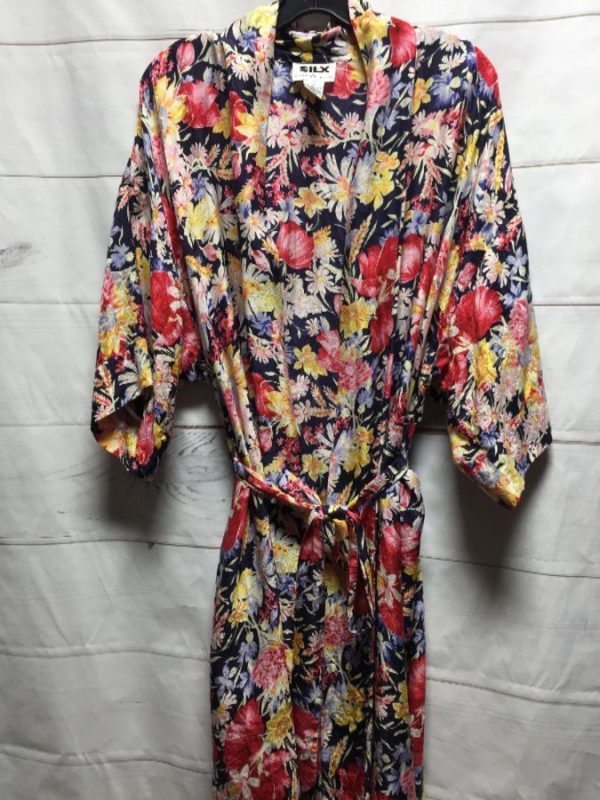 Silx By August Kimono robe, silk, long length, floral design, white pink red yellow/navy blue/purple/orange, size S