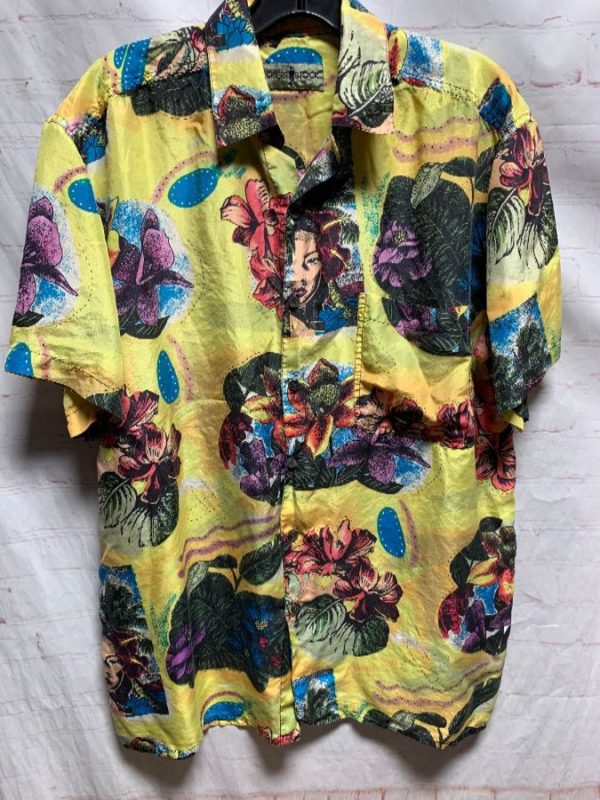 Robert Stock Hawaiian shirt, silk, short sleeves, button-up, woman & tropical floral print, yellow/pink/blue/purple/green/black, size L