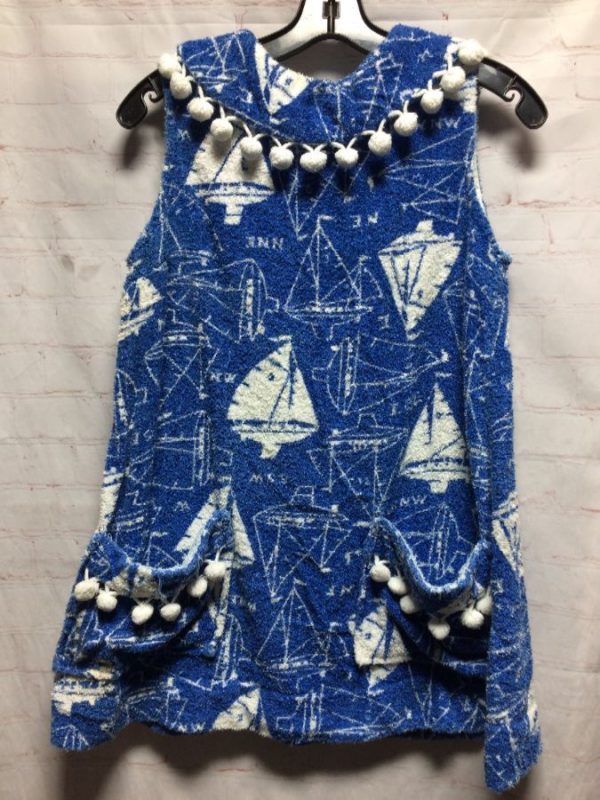 1960’S TERRY CLOTH SLEEVELESS BLOUSE W/ SAIL BOAT & POM POM DETAIL