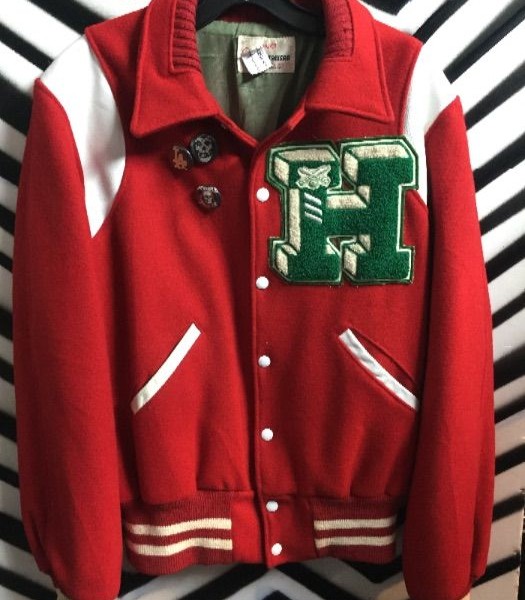 Vintage 1950’s Letterman jacket, button-up, with sporting event letter H and pins, red jacket with white trim and green H, size L